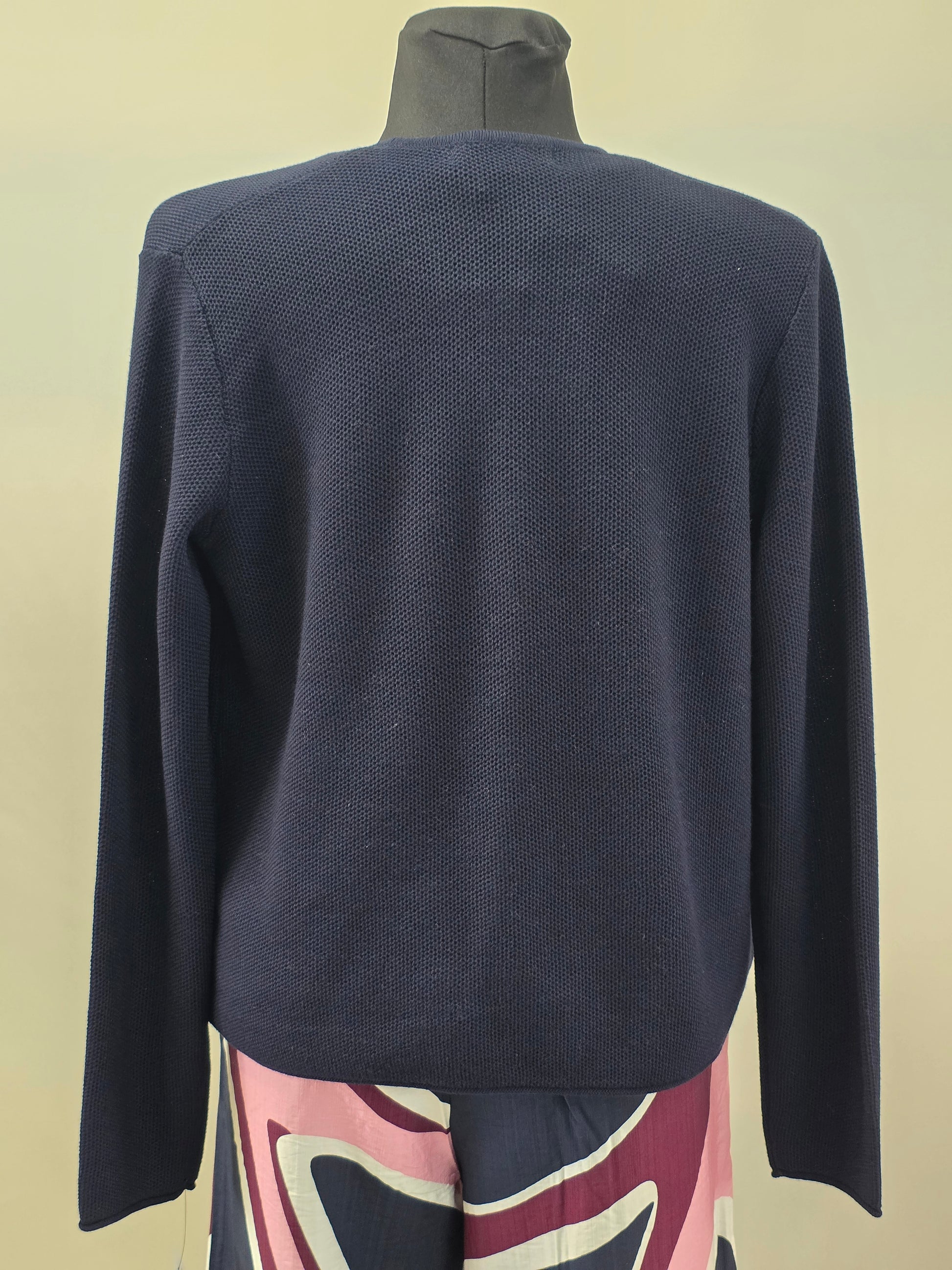 Dieser Cardigan in klassischem Dunkelblau überzeugt mit seinem weichen Materialmix aus 50% Baumwolle und 50% Polyacryl, der angenehm auf der Haut liegt und gleichzeitig pflegeleicht ist. Sein zeitloses Design macht ihn zu einem vielseitigen Kombipartner, der sich mühelos in jede Garderobe integrieren lässt. Besonders schön kommt er in Kombination mit unserem exklusiven Set aus dem Onlineshop zur Geltung – für einen harmonischen, stilvollen Look, der Eleganz und Gemütlichkeit vereint.