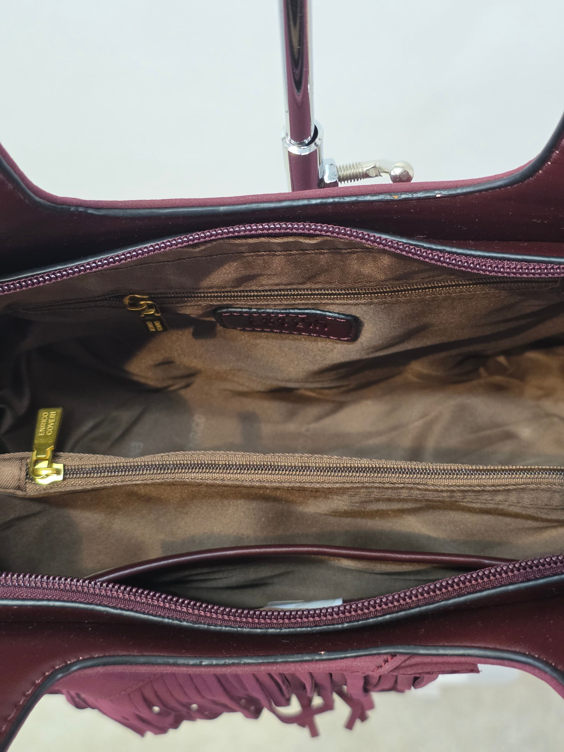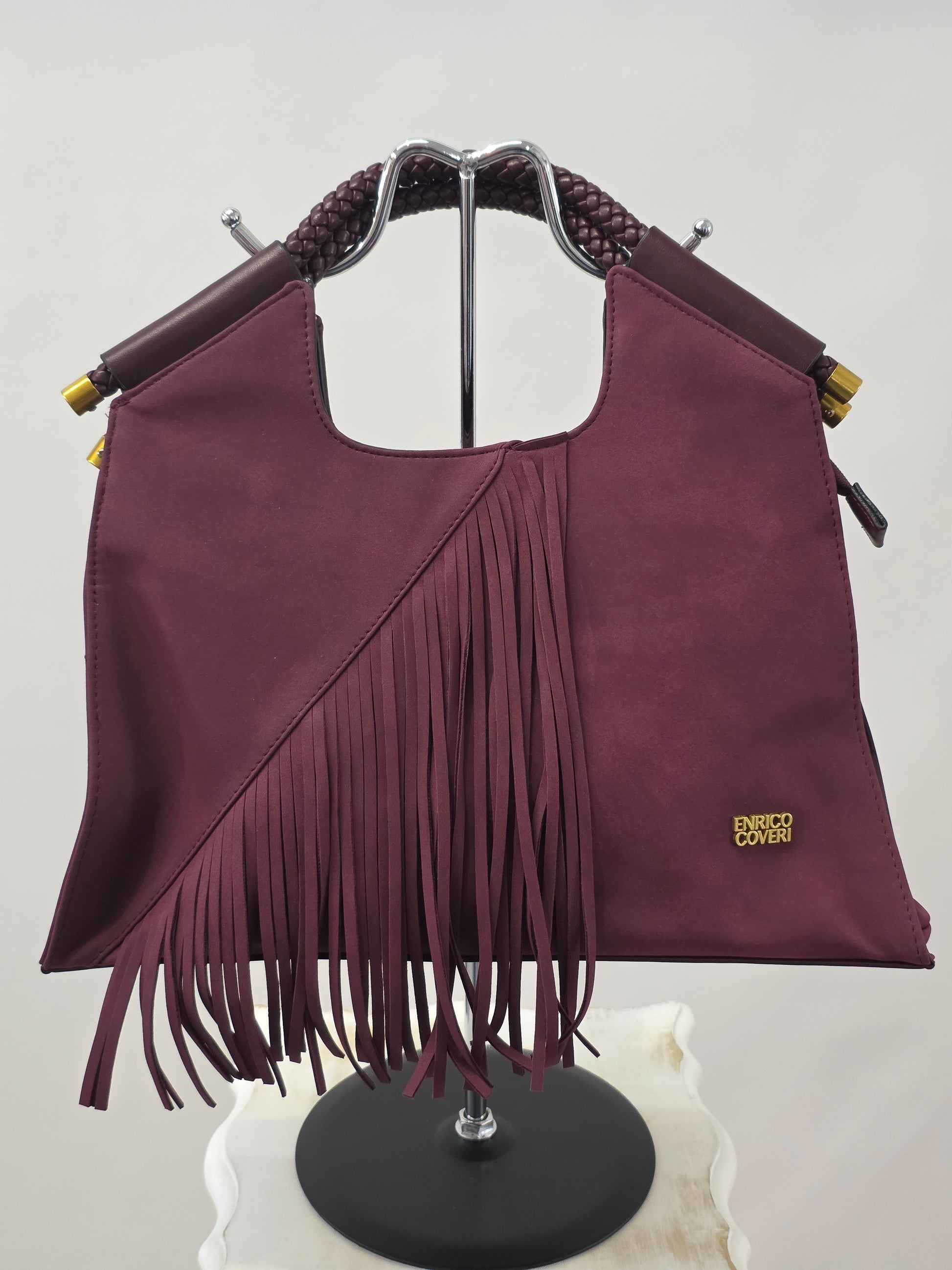 Diese Handtasche kombiniert lässigen Boho-Charme mit einem modernen Twist. Gefertigt aus weichem Kunstveloursleder, besticht sie durch ihre markanten Fransen auf der Vorderseite, die dem Look Bewegung und Individualität verleihen. Die geflochtenen Henkel setzen einen raffinierten Akzent, während der praktische Umhängegurt für Flexibilität im Alltag sorgt. Innen bietet die Tasche zwei sichere Reißverschlusstaschen, perfekt für alle Essentials. Ein stilvoller Begleiter für alle, die Wert auf Details legen und ein cooles, unkompliziertes Statement setzen möchten.