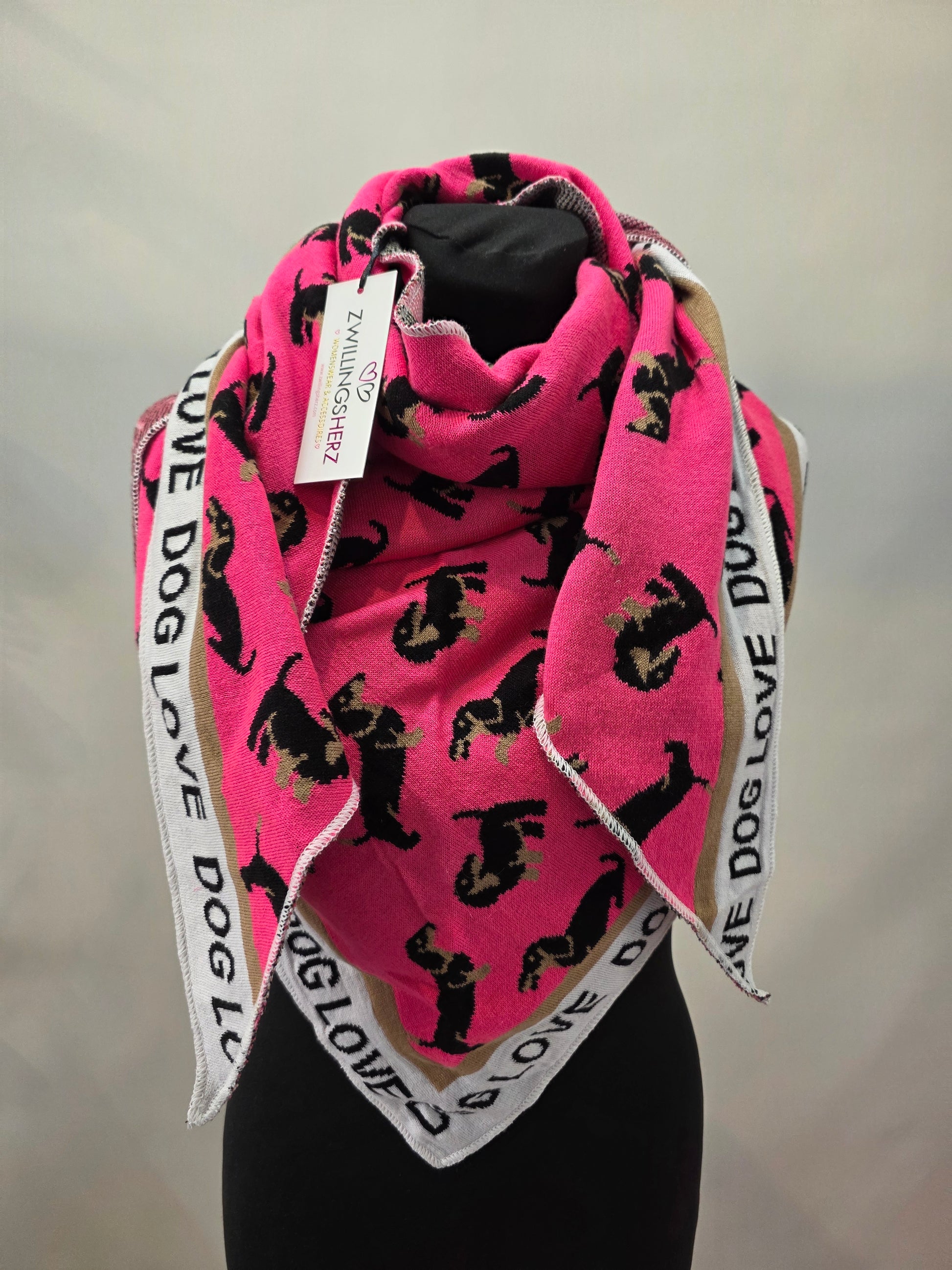 Der große Dreieckschal „Dog Love“ mit Dackelmotiv ist das perfekte Accessoire für alle Hundeliebhaber. In den harmonischen Farben Pink, Schwarz, Beige und Weiß setzt er einen modischen Akzent und sorgt für einen besonderen Look. Mit einer Breite von etwa 1,95 Metern und einer Länge von 90 Zentimetern bis zur Spitze bietet er viele Tragemöglichkeiten, ob locker um die Schultern gelegt oder klassisch als Schal gebunden. Das Material aus 50 % Baumwolle und 50 % Polyacryl sorgt für angenehme Wärme und hohen Tragekomfort – ideal für kühle Herbst- und Wintertage.