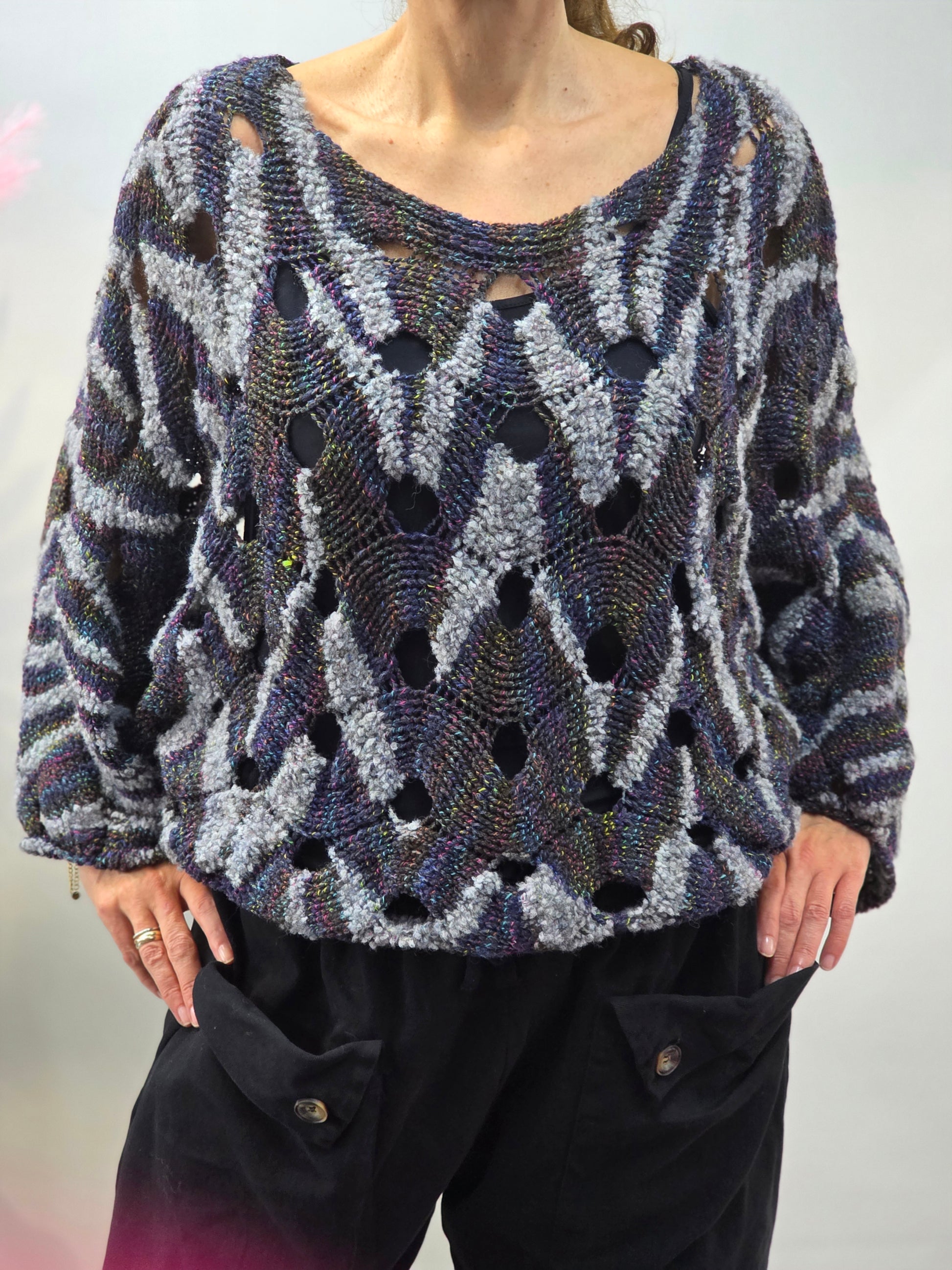 Stylischer Strickpullover in Grau, Blau, Pink Gelb und grünen Fäden.– alle Farben harmonisch in einem Design kombiniert. Mit elegantem Lochmuster, luftigen Schmetterlingsärmeln und kurzem Schnitt bis zur Hüfte ist er vielseitig einsetzbar.