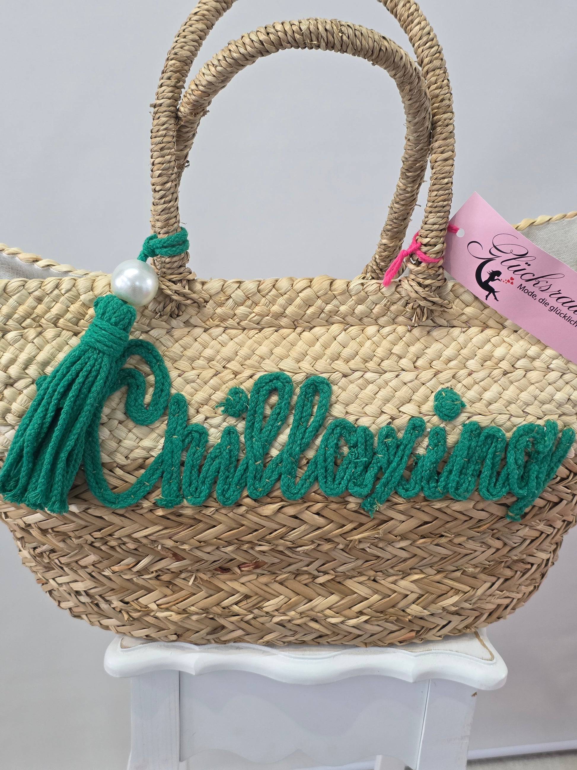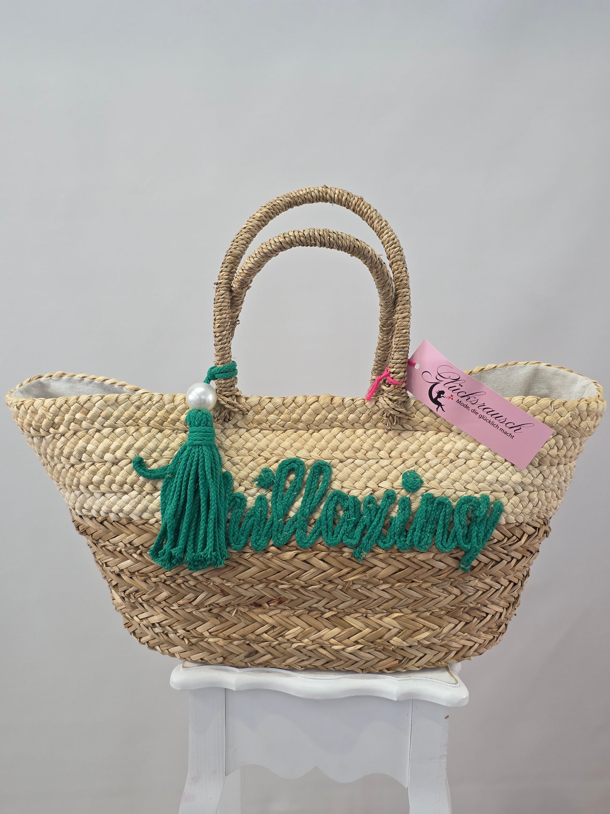 Dieser Strandkorb bringt sommerliche Leichtigkeit in jedes Outfit. Gefertigt aus robustem Material und mit einem sicheren Reißverschluss versehen, bietet er genügend Platz für alle Essentials. Die grüne Aufschrift setzt einen frischen Akzent, während der dicke Quast mit dekorativer Perle einen verspielten, eleganten Touch verleiht. Ob am Strand, beim Stadtbummel oder im Urlaub – dieser Korb ist der perfekte Begleiter für sonnige Tage.